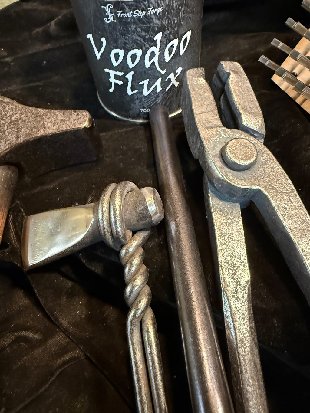 Deluxe beginners kit . This contains the same hand forged hammer tongs and punch of the basic kit with the addition of a handled hot cut, blade type aggressive wire brush and a can of voodoo forge welding flux. These are the essential starting point for forging your own art work and tools